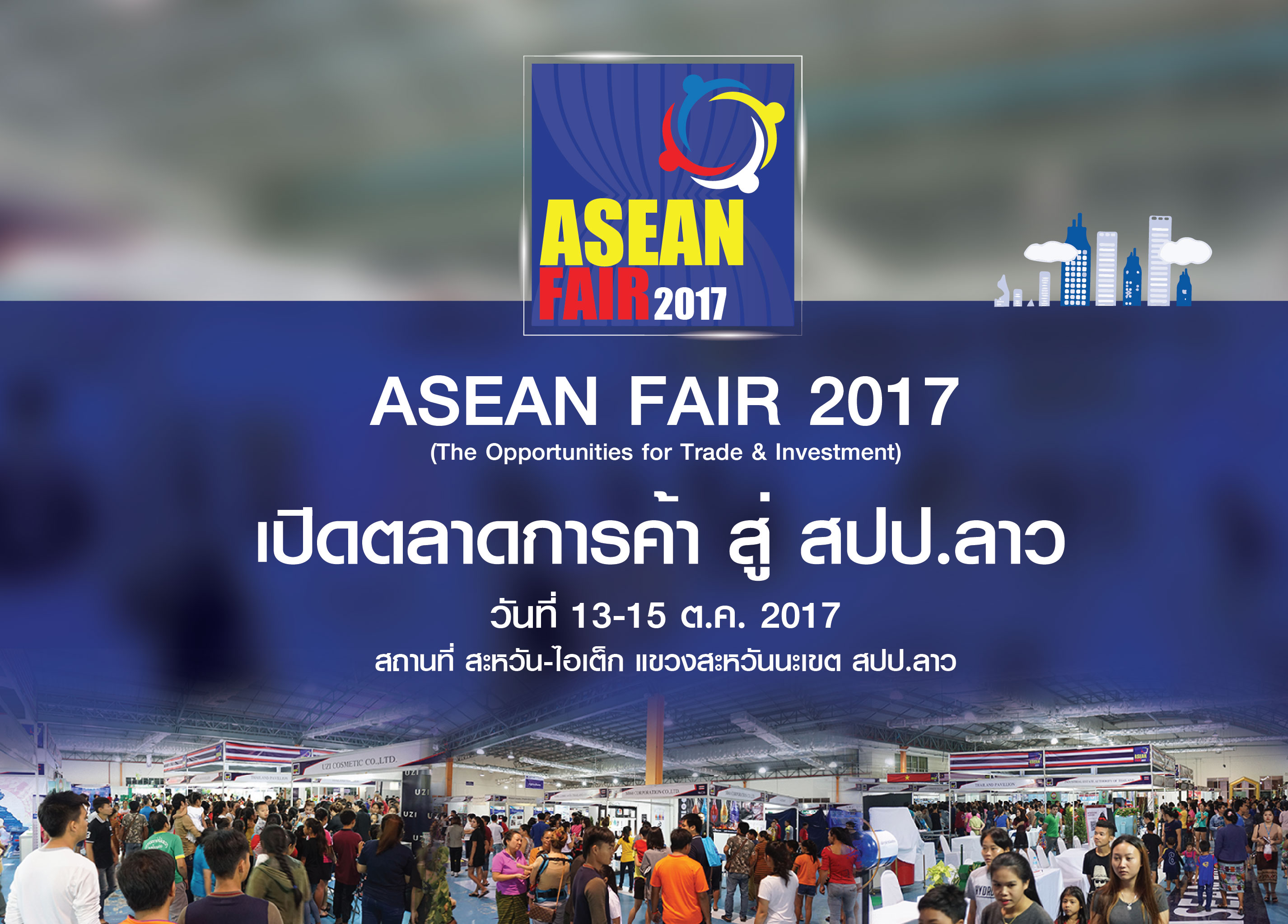 มหกรรมงานแสดงสินค้าครั้งยิ่งใหญ่ ASEAN FAIR 2017 ณ สะหวัน-ไอเต็ก แขวงสะหวันนะเขต สปป.ลาว ในครั้งนี้ มีการจัดแสดงสินค้ามากกว่า 1,000 รายการ จาก 100 แบรนด์ในไทย ประกอบด้วย 4 กลุ่มอุตสาหกรรมใหญ่ อาทิ อุตสาหกรรมเครื่องจักรทางการเกษตรและอุปกรณ์เครื่องมือต่าง ๆ , อุตสาหกรรมก่อสร้าง เครื่องมือ เครื่องจักรในโรงงาน , อาหารและเครื่องดื่มและสินค้าอุปโภค บริโภค และ อุตสาหกรรมเทคโนโลยีทางการแพทย์ สุขภาพและความงาม โดยภายในงานมีกิจกรรมมากมาย อาทิ การประกวด นวัตกรรม ASEAN INNOVATION DESIGN 2017 จากนักศึกษาในกลุ่มประเทศอาเซียน, กิจกรรม Business Matching จับคู่ธุรกิจเพื่อให้เกิดการต่อยอดการค้าการลงทุน พร้อมสัมมนา เคล็ดลับการให้ความรู้ต่าง ๆ จากผู้มีประสบการณ์โดยตรงหลากหลายแบรนด์ดัง นอกจากนี้ยังมีคณะทูตพาณิชย์จากประเทศต่างๆ ในกลุ่มอาเซียน ให้คำปรึกษาการค้า การลงทุน และกระทบไหล่ดาราดังจากเมืองไทย มินิคอนเสิร์ตจาก พอร์ช ศรัณย์ และ ณิชา ณัฎฐณิชา นักแสดงชื่อดังจากช่อง7 และ ช่อง3 พร้อมชมแฟชั่นโชว์น่ารักจากเด็กในกลุ่มประเทศอาเซียน