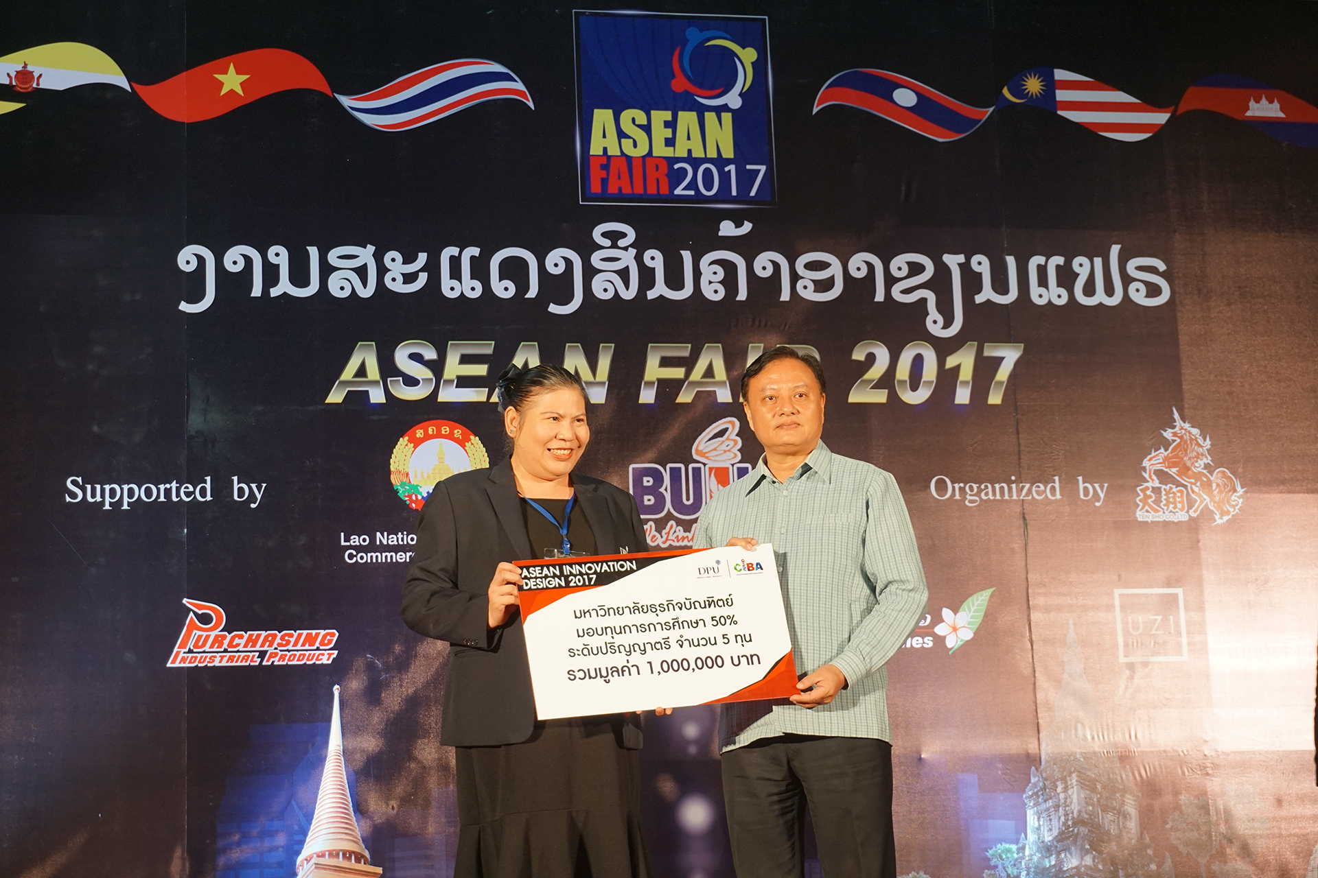 นางสิรามน ศรีเขียว ประธานบริหาร บริษัท เทนโชจำกัด ผู้จัดงาน ASEAN FAIR 2017 ได้มอบทุนการศึกษาจากการประมูลสิ่งของจากศิลปินดาราจากเมืองไทย และ ทุนการศึกษาจากมหาวิทยาลัยธุรกิจบัณฑิตย์ ให้แก่สถาบันการศึกษา 3 แห่ง ในแขวงสะหวันนะเขต ซึ่งจัดขึ้นที่ สะหวันไอเต็ก สปป.ลาว โดยมีเลขาสภาการค้าและอุตสาหกรรมสะหวันนะเขต เป็นตัวแทนในการรับมอบทุนการศึกษาครั้งนี้