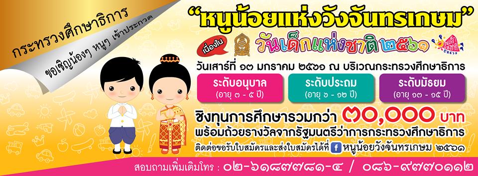 กระทรวงศึกษาธิการ เชิญชวนน้องๆ หนูๆ ร่วมกิจกรรมการประกวด “หนูน้อยแห่งวังจันทรเกษม” เพื่อส่งเสริมให้เด็กกล้าแสดงออกในทางที่ถูกต้องและปลูกจิตสำนึกความเป็นไทย ด้วยการให้ผู้เข้าประกวดแต่งกายด้วยชุดไทย (ยุคไหนก็ได้) โดยแบ่ง 3 ระดับ คือ ระดับอนุบาล (อายุ 3 – 5 ปี), ระดับประถม (อายุ 6 – 12 ปี) และระดับมัธยม (13 – 15 ปี) ซึ่งแบ่งประเภทเป็นชาย-หญิง ชิงทุนการศึกษารวมกว่า 30,000 บาท และถ้วยรางวัลจากรัฐมนตรีว่าการกระทรวงศึกษาธิการ