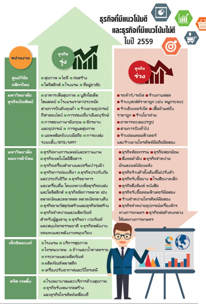 ในปี 2559 ธุรกิจที่ยังมีอัตราการขยายตัวสูง หรือธุรกิจดาวรุ่ง หรือธุรกิจที่อยู่ในช่วงขาลง หรือธุรกิจดาวดับ จะเป็นประเภทธุรกิจใดบ้าง ก็ล้วนขึ้นอยู่กับภาวะเศรษฐกิจทั้งภายในและภายนอกประเทศทั้งสิ้น