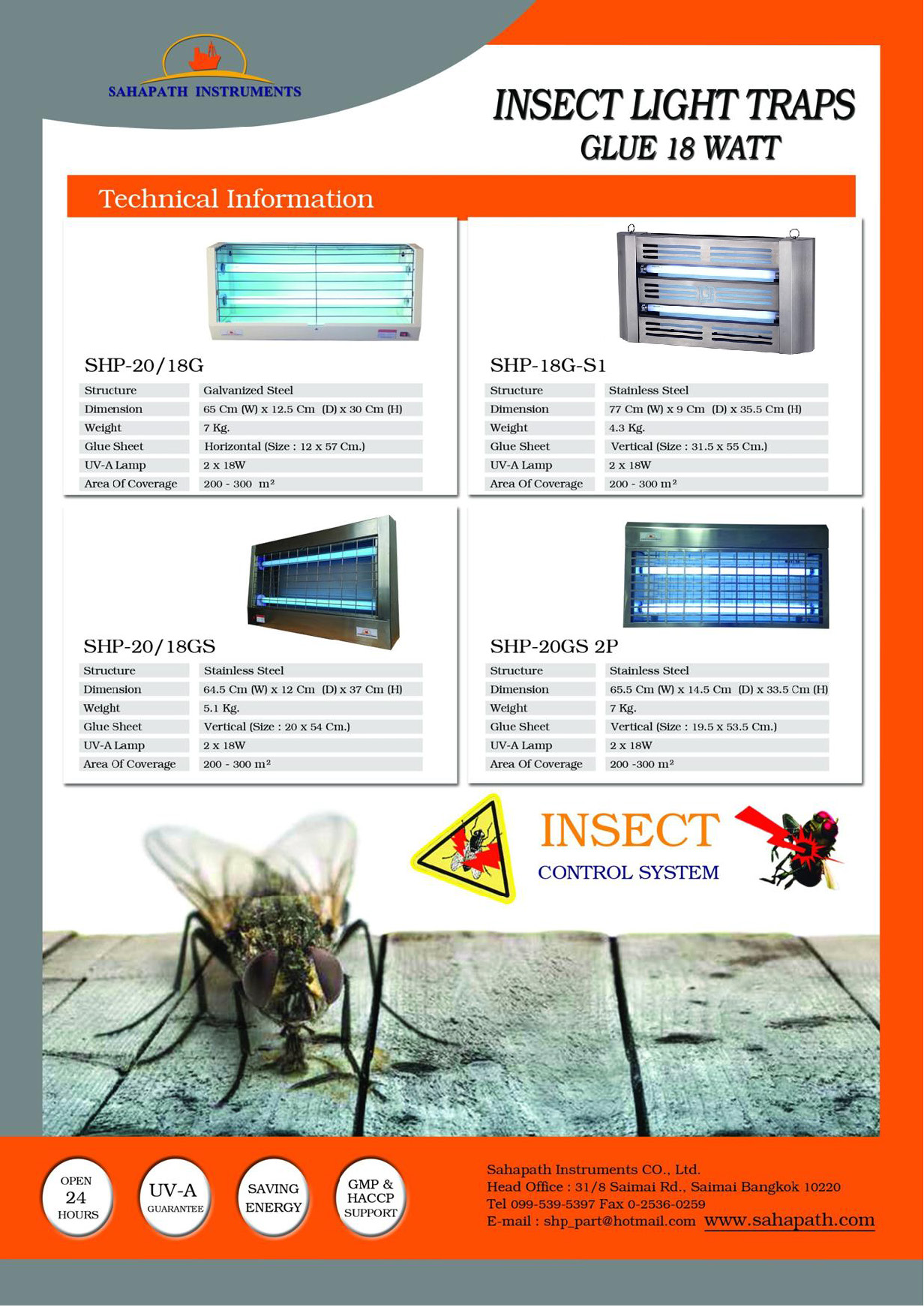 -เครื่องดักแมลงแบบกาวรุ่น 18 Watt : ความยาวหลอดประมาณ 60 ซม. ครอบคลุมพื้นที่ 200-300 ตร.ม.