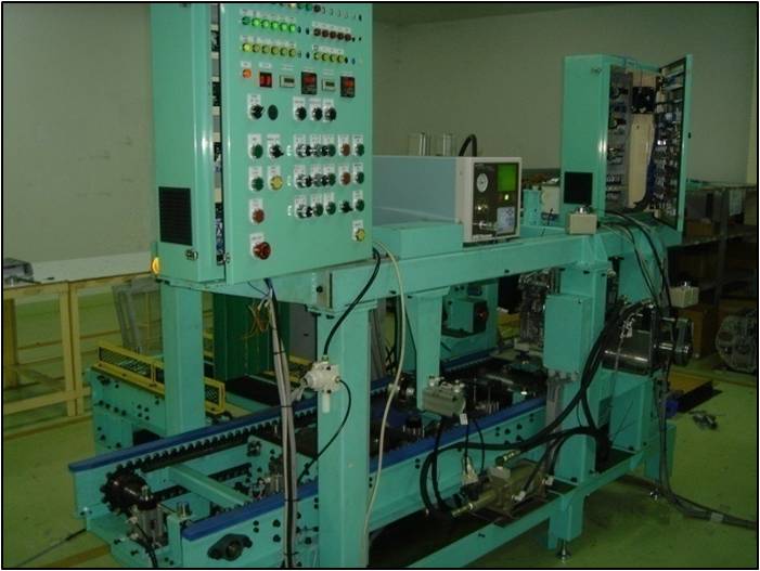 คำอธิบาย : This is a stand alone leak test machine for the engine bushing. The engine block is mounted on a pallet and loaded on the tester. The engine shaft is coupled with the tester and rotated during leak test.