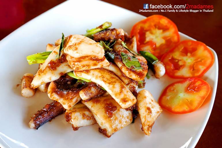 เรามาเริ่มกันที่เมนูแนะนำท้องถิ่นอย่าง ปลาหมึกผัดกะปิ ต้องยอมรับเลยว่ากะปิเค้าดีจริง ๆ ผัดกับปลาหมึกสด ๆ ที่ผัดได้สุกกำลังดี เนื้อปลาหมึกไม่มีเหนียวเลย แถมรสชาติกลมกล่อมมากๆ อีกด้วย คลุกกับข้าวสวยร้อน ๆ ให้เด็ก ๆ ทานจานนี้หมดเกลี้ยงในพริบตาเลย