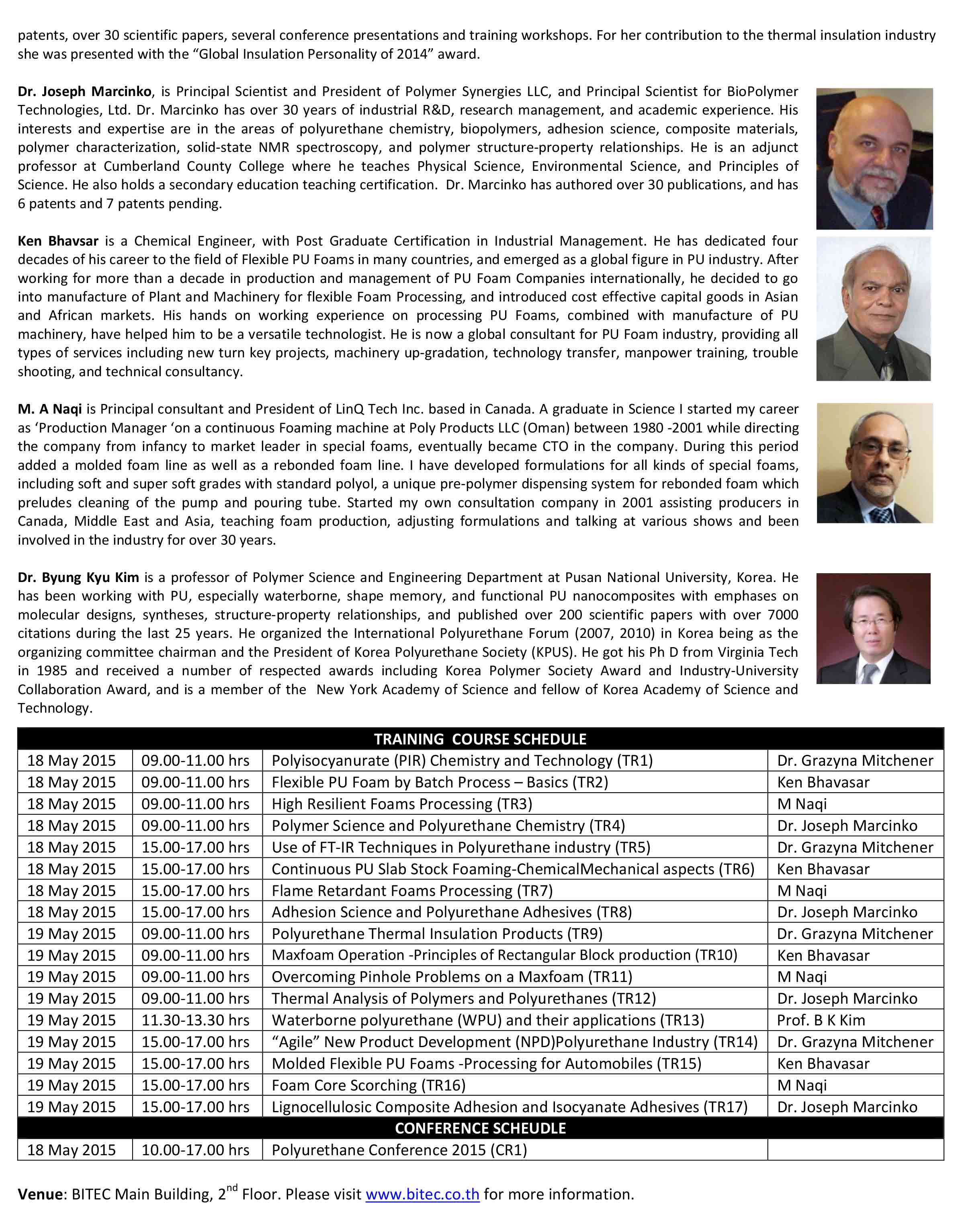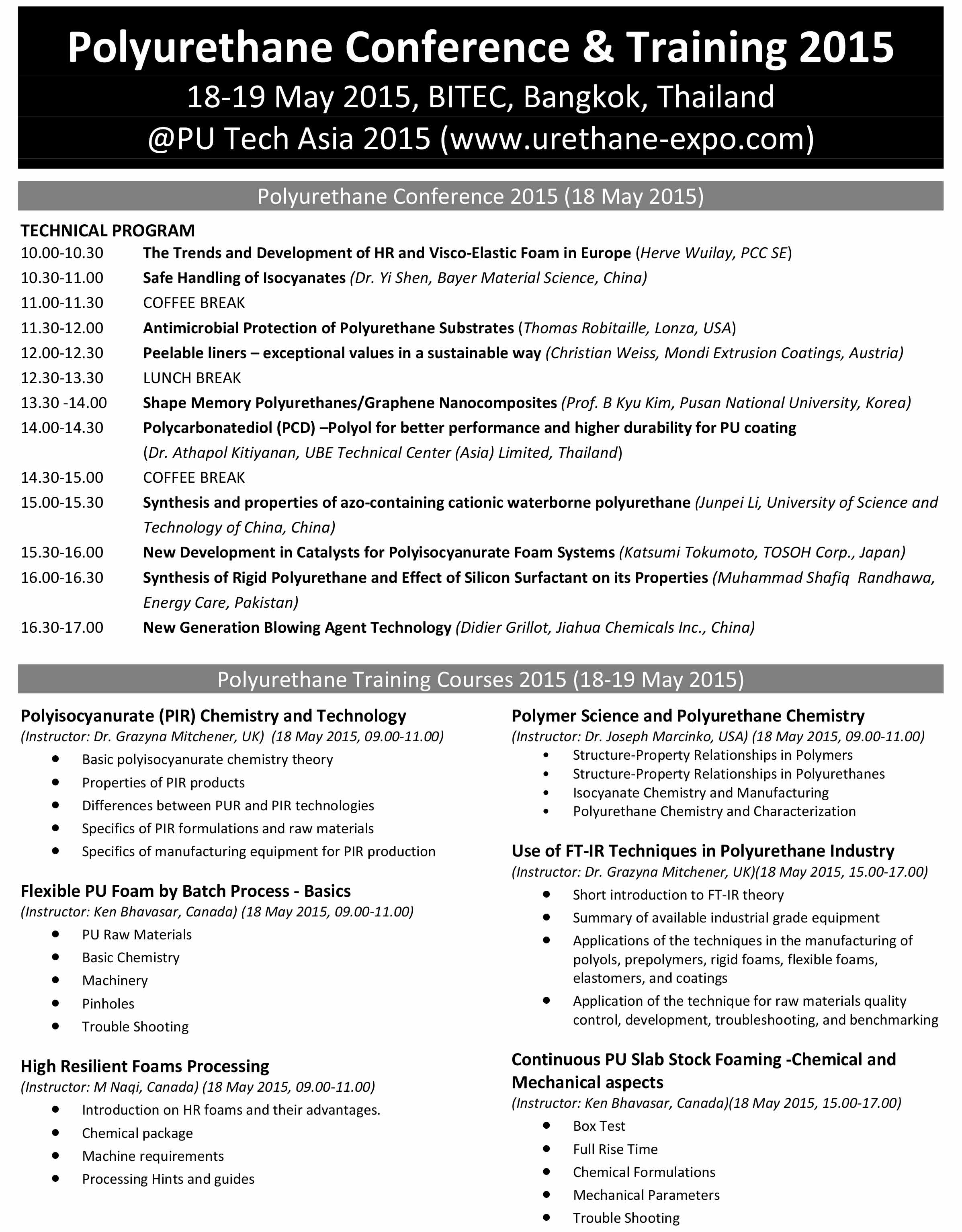 นอก จากงานแสดง สินค้า ยังมีงานอบรมและงานประชุมเทคโนโลยีด้านโพลียูรีเทน บรรยายโดยผู้เชี่ยวชาญด้านโพลียูรีเทนจากหลายประเทศ สำหรับข้อมูลเพิ่มเติมของงานประชุมโปรดดูเพิ่มเติมดัง เอกสารแนบ (บรรยายเป็นภาษาอังกฤษ)