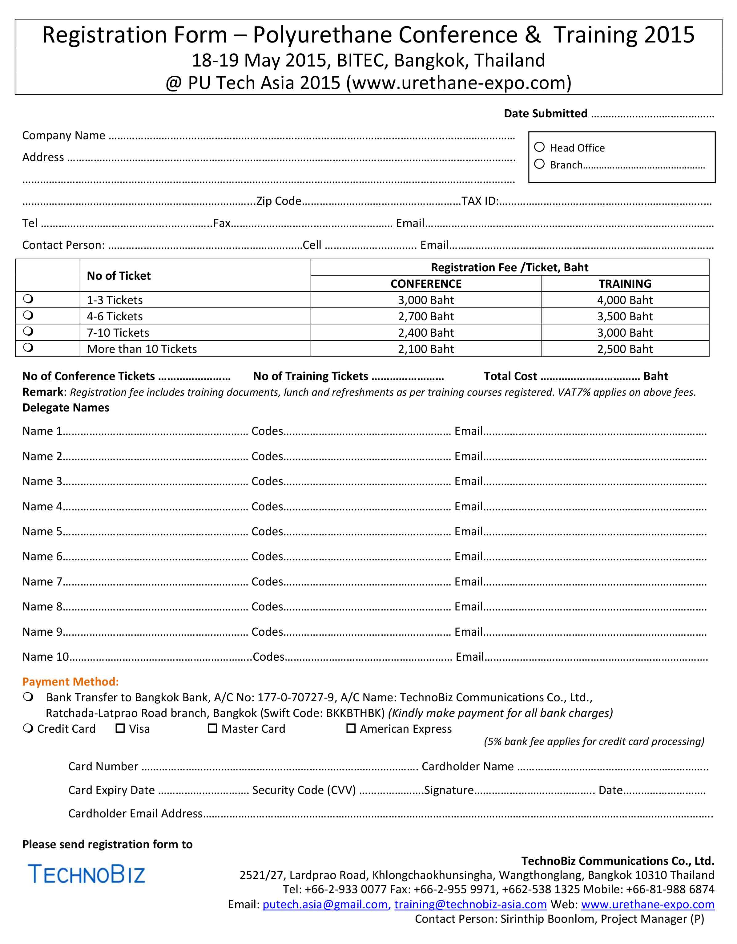 บริษัท เทคโนบิซ คอมมิวนิเคชั่นส์ จำกัด ขอเชิญบุคลากรในภาคอุตสาหกรรมโพลียูรีเทนเข้าชมงานแสดงสินค้า “PU Tech Expo 2015” ซึ่ง จัดระหว่างวันที่ 18-19 พฤษภาคม 2558 ณ ไบเทค-บางนา กรุงเทพฯ ท่านที่มีความประสงค์เข้าชมงานสามารถลงทะเบียนล่วงหน้า ได้ทางเว็บไซต์ www.urethane-expo.com ตั้งแต่บัดนี้เป็นต้นไป