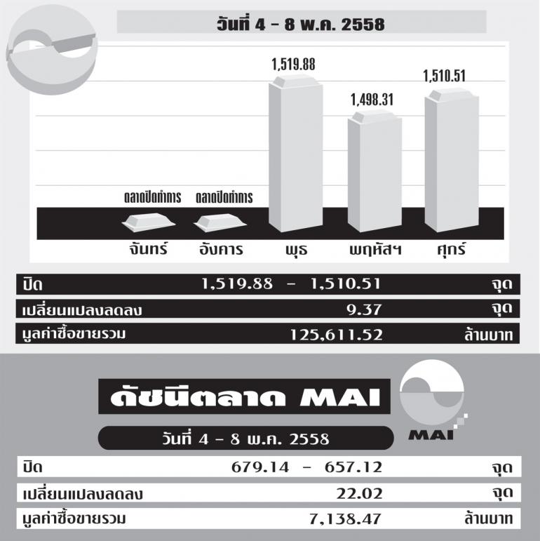 สำหรับภาวะดัชนี SET สัปดาห์ที่ผ่านมา ร่วงลงปิดต่ำกว่า 1,500 จุด ในวันพฤหัสบดี แต่ฟื้นตัวได้ช่วงท้ายสัปดาห์ โดยปิดที่ระดับ 1,510.51 จุด ลดลง 1.06% จากสัปดาห์ก่อน มูลค่าการซื้อขายเฉลี่ยต่อวันลดลง 5.87% จากสัปดาห์ก่อน มาอยู่ที่ 45,958.60 ล้านบาท ส่วนตลาดหลักทรัพย์ MAI ปิดที่ 657.12 จุด ลดลง 4.61% จากสัปดาห์ก่อน