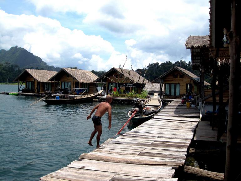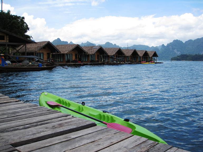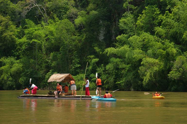 ในบริเวณเขื่อนรัชชประภาจะมีที่พักของหน่วยพิทักษ์อุทยานแห่งชาติเขาสกไว้บริการนักท่องเที่ยว และมีที่พักแบบแพลอยน้ำไว้บริการหลายแห่ง นอกจากจะได้พักผ่อนชิลชิลบนแพแล้ว ยังมีกิจกรรมสนุกๆ ให้ลองเล่นมากมาย เช่น การพายเรือแคนู การเดินชมถ้ำที่ ถ้ำน้ำทะลุ เป็นถ้ำใหญ่ที่มีธารน้ำไหล มีหินงอกหินย้อยที่งดงาม เป็นต้น 7. แพริมน้ำ ลำน้ำแคว จ.กาญจนบุรี มาปิดท้ายกับอีกหนึ่งสถานที่ที่เหมาะกับการพักผ่อนบนแพชิลชิลในหน้าฝน นั่นคือ แพริมแม่น้ำแคว จ.กาญจนบุรี ว่ากันว่าที่นี่คือดินแดนแห่งธรรมชาติอันอุดมสมบูรณ์ด้วยผืนป่า พรรณไม้ โถงถ้ำ น้ำตก และประเพณีวัฒนธรรมอันหลากหลายของผู้คนหลากเชื้อชาติที่อาศัยอยู่ร่วมกันอย่างเอื้ออารี ทั้งไทย พม่า มอญ ปกากะญอ (กะเหรี่ยง) ฯลฯ พื้นที่ส่วนใหญ่ของจังหวัดเป็นป่าและเทือกเขาสูง โดยมีแม่น้ำสายสำคัญ 2 สาย คือ แม่น้ำแควใหญ่และแม่น้ำแควน้อย ที่ไหลขนานลงมาบรรจบกันเป็นแม่น้ำแม่กลองที่ตัวเมืองกาญจนบุรี