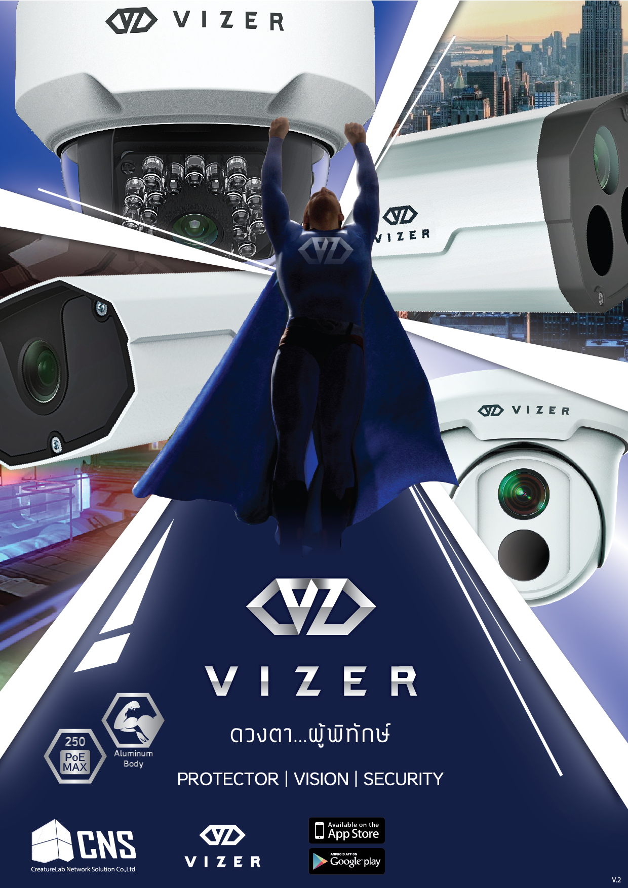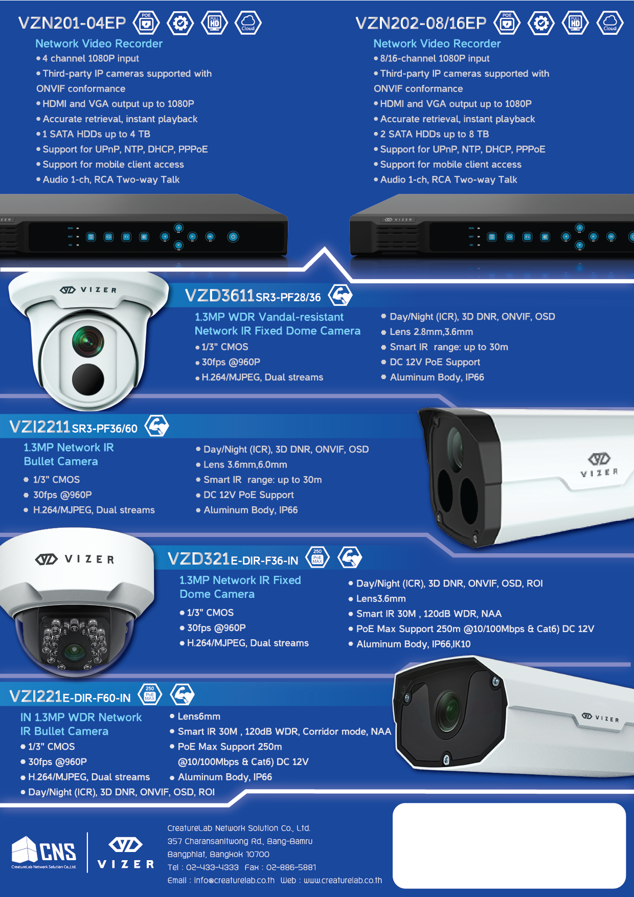 กล้องวงจรปิดระบบ IP แบรนด์แรกของคนไทยที่ได้รับมาตรญาน ONVIF คิดค้นและพัฒนาโดยทีมงานวิศวกรผู้เชี่ยวชาญของ CNS คุณสมบัติครบ รองรับการใช้งานทุกพื้นที่ อีกทั้งติดตั้งและใช้งานง่าย ดูผ่านมือถือด้วยแอปพลิเคชัน Vizereyes ผ่านระบบ Cloud