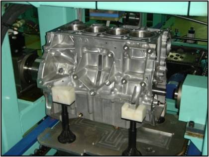 คำอธิบาย : This is a stand alone leak test machine for the engine bushing. The engine block is mounted on a pallet and loaded on the tester. The engine shaft is coupled with the tester and rotated during leak test.